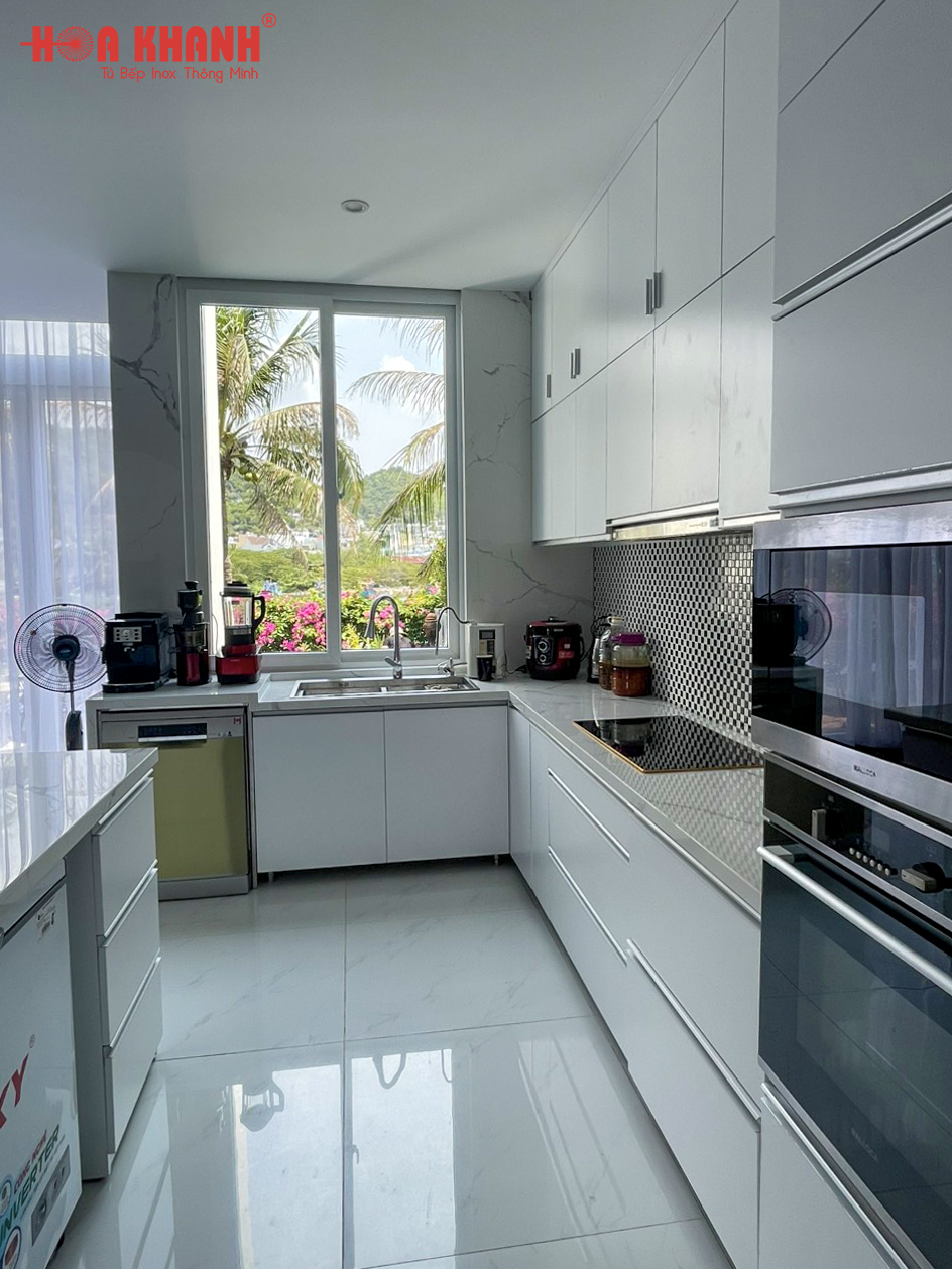 Phong cách hiện đại, tủ bếp được ốp mặt đá, tông màu trắng trang nhã, tinh tế, hiện đại. Sự cải tạo này giúp gian bếp có diện mạo hoàn toàn mới, trở nên sang trọng hơn, chất liệu inox an toàn cho người sử dụng.