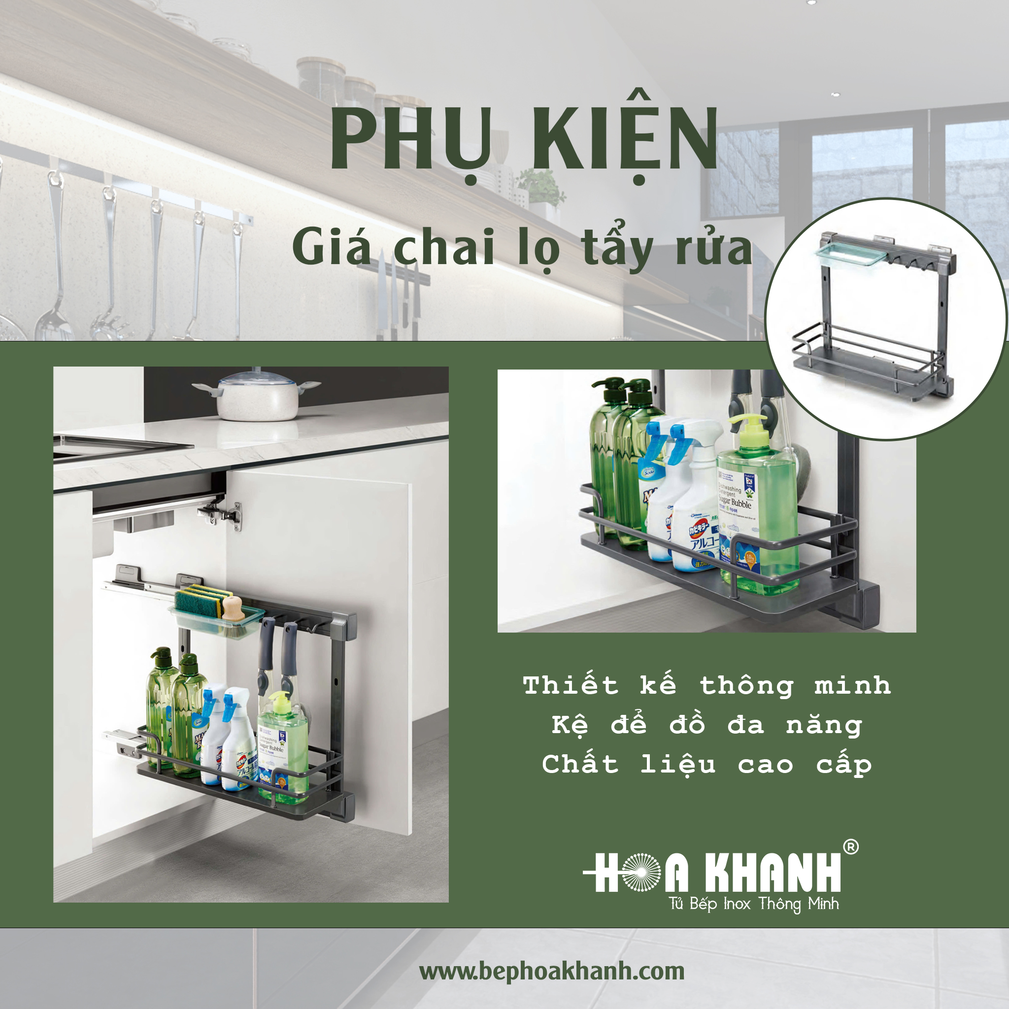 Không còn cảnh chai lọ ngổn ngang, ẩm ướt dưới gầm bồn rửa khi trang bị phụ kiện giá chai lọ tẩy rửa. Với nhiều lựa chọn về mẫu mã, nhưng đều sẽ có khay đựng các dụng cụ vệ sinh bếp như dung dịch tẩy rửa, bao tay, khăn, bàn chải,…