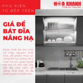 Đây là phụ kiện tuyệt nhất trong tủ bếp vì độ tiện lợi. Với trợ lực nâng lên hạ xuống với 4 mức, giúp người nội trợ có thể sắp xếp bát đĩa một cách dễ dàng, khai thác tối đa không gian tủ bếp trên. Giá hai tầng, có khay hứng nước, giá bát nâng hạ là phụ kiện thông minh và tinh tế. Kích thước rộng khá đa dạng từ 600mm đến 900mm, lắp được hầu hết các loại bếp