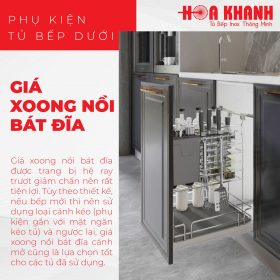 Giá xoong nồi bát đĩa tủ bếp dưới là phụ kiện cơ bản và có thể nói là không thể thiếu trong không gian tủ bếp dưới. Xoong nồi bát đĩa thường xuyên sử dụng nên sắp đặt phía dưới để tiện lợi cho việc thao tác nấu nướng, vệ sinh và cất giữ. Giá xoong nồi bát đĩa về chất liệu thì có thể chia thành 2 loại, loại inox nan và inox hộp được trang bị hệ ray trượt giảm chấn nên rất tiện lợi. Tùy theo thiết kế, phụ kiện có thể được lắp hệ tủ cánh kéo hoặc cánh mở.