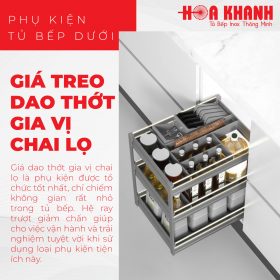 Có thể nói, giá để dao thớt gia vị chai lọ là phụ kiện thiết kế tốt nhất, tối ưu không gian sử dụng, được chế tác bằng vật liệu thép không gỉ. Dù phụ kiện này chỉ chiếm không gian nhỏ trong tủ bếp, thường 20 cm đến 30cm chiều rộng tủ có thể có một không gian chứa đựng từ gia vị, chai lọ nhiều kích thước, và cả dao thớt. Giá để dao thớt có hệ ray trượt giảm chấn giúp cho việc vận hành và trải nghiệm tuyệt vời khi sử dụng loại phụ kiện tiện ích này.