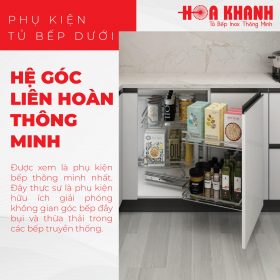Hệ góc liên hoàn thông minh được xem là phụ kiện bếp thông minh nhất. Đây thực sự là phụ kiện hữu ích giải phóng không gian góc bếp đầy bụi, có phần dư thừa trong các bếp truyền thống. Hệ tủ góc không chỉ tận dụng tối đa diện tích bếp mà còn tạo điểm nhất hiện đại cho gian bếp. Hệ góc liên hoàn thông minh với hệ thống ra kéo khai thác tối ưu không gian trong góc mỗi tủ bếp bằng các giá rổ đựng kéo ra đẩy vào một cách khéo léo và thông minh.