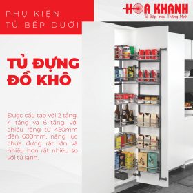 Nếu như tủ lạnh là nơi chứa đựng những thức ăn cần bảo quản trong điều kiện lạnh và ướt thì hệ giá kho như tên gọi của nó là kho để những đồ khô. Tủ đựng đồ khô là phụ kiện quan trọng trong tủ bếp, nhất là bếp lớn ở các gia đình với các mẫu bếp chữ L.