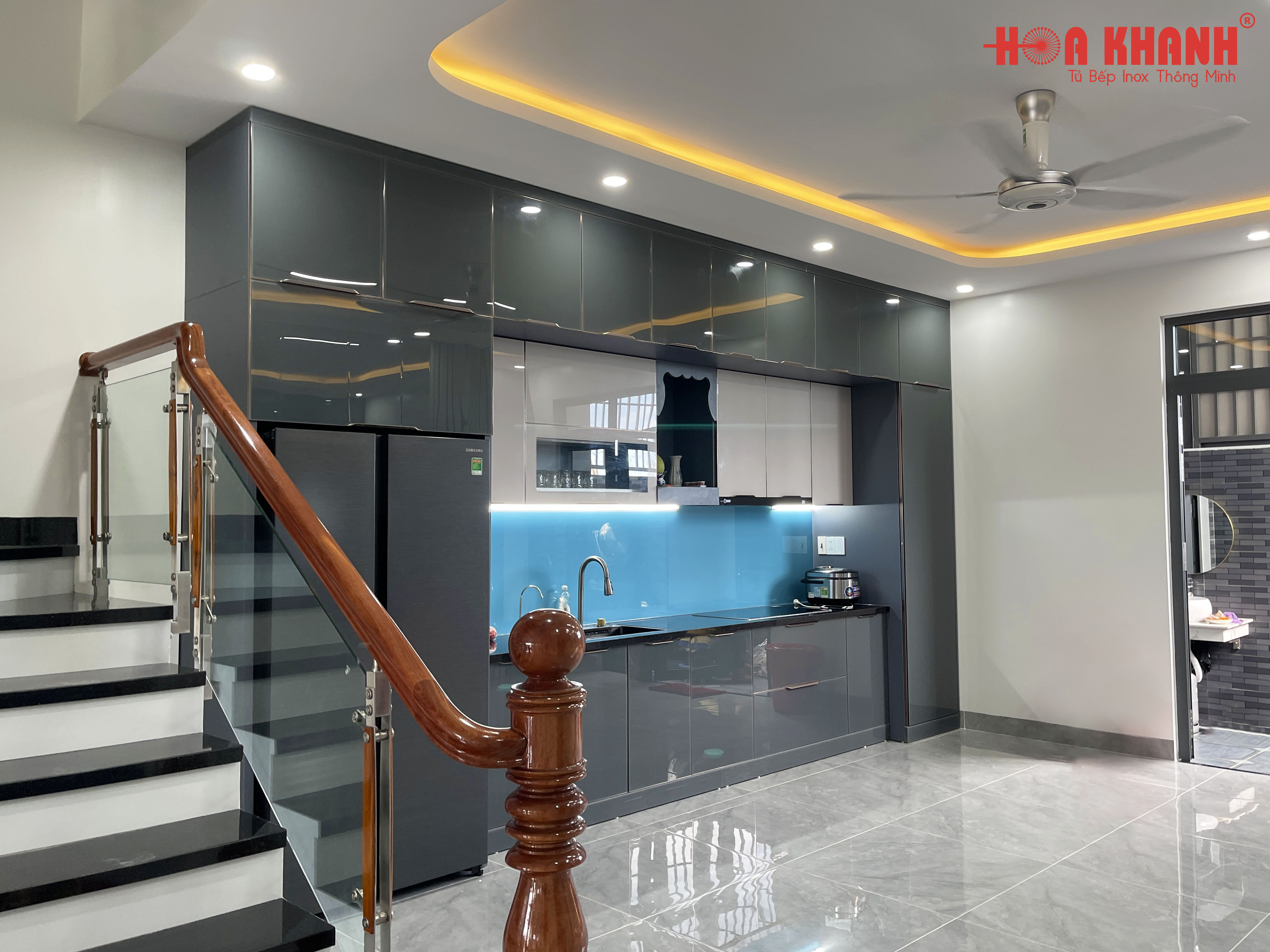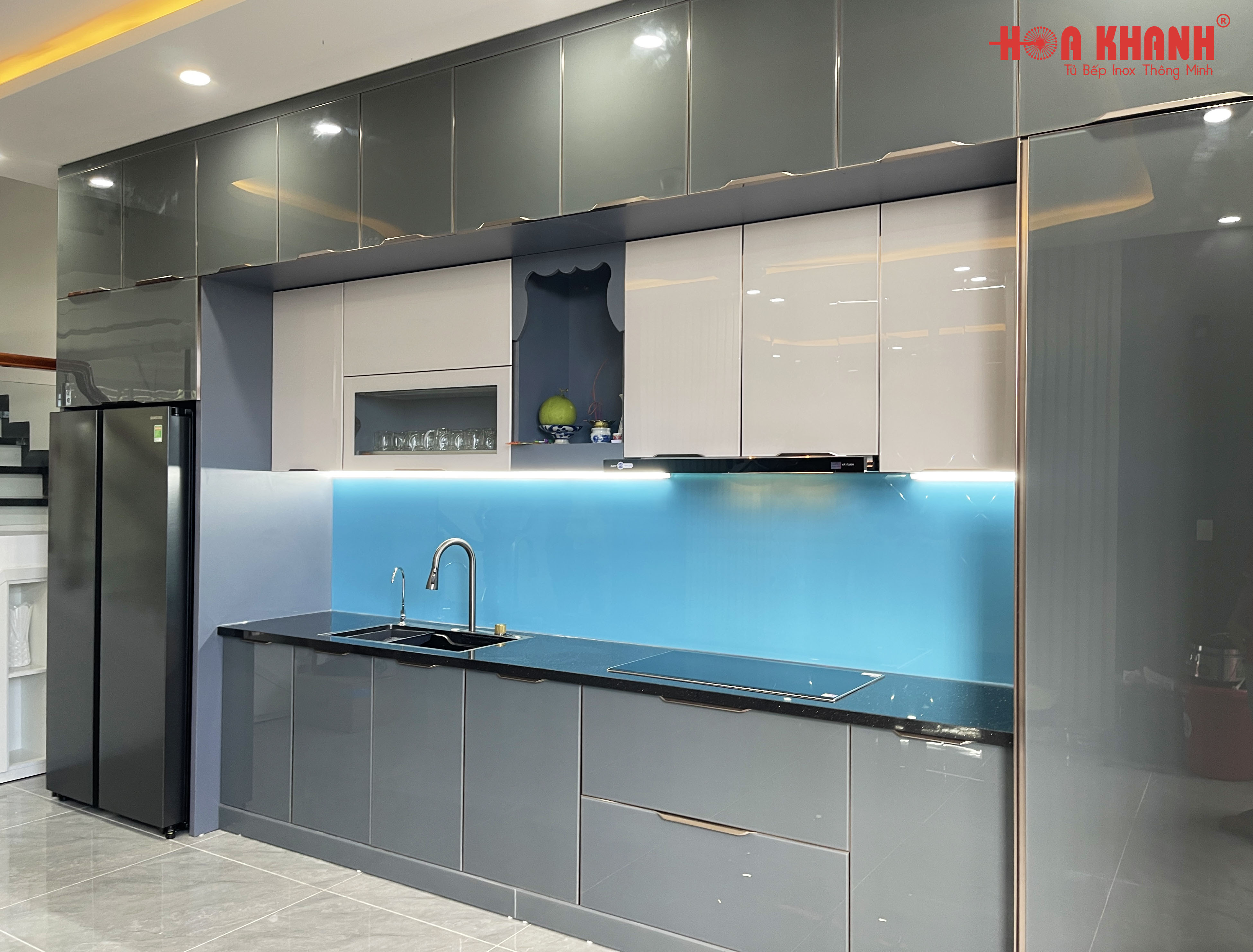 Gia chủ trẻ và năng động nên tủ bếp được chọn thực hiện với phong cách hiện đại, tông màu chủ đạo là màu xám trung tính, vừa sang trọng, vừa dịu mắt, hài hòa với màu tường và gạch. Đồng thời phong cách tủ bếp và màu sắc cũng dễ dàng phối các phụ kiện bếp.