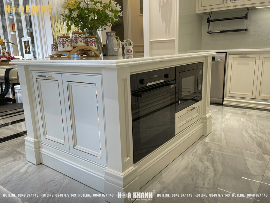 Bàn đảo được thiết kế để tích hợp nhiều phụ kiện thông minh như hộc để lò nướng, hộc để lò vi sóng, tủ gạo, khay trượt để nồi cơm điện hiện đại, đầy đủ công năng, dễ dàng thao tác.